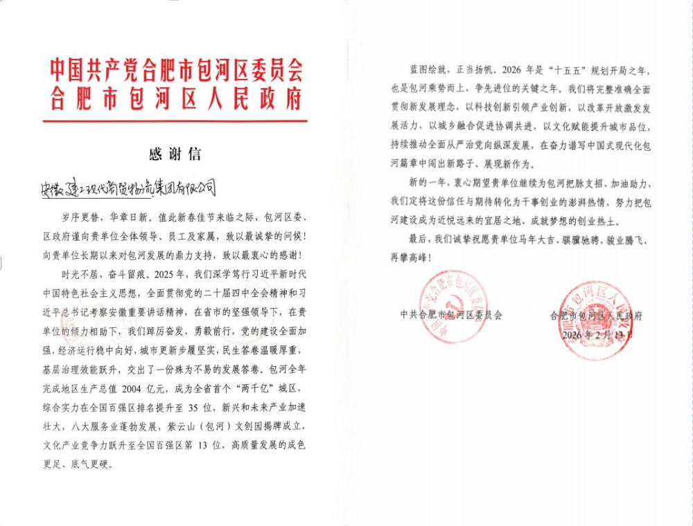 近日,建工商貿(mào)物流收到合肥市包河區(qū)委、區(qū)政府發(fā)來的感謝信,區(qū)委、區(qū)政府在信中向公司全體領(lǐng)導(dǎo)、員工及家屬致以誠摯的新春問候,對公司長期以來鼎力支持包河區(qū)發(fā)展致以衷心感謝,并送上馬年大吉、騏驥馳騁,駿業(yè)騰飛、再攀高峰的美好祝愿。
