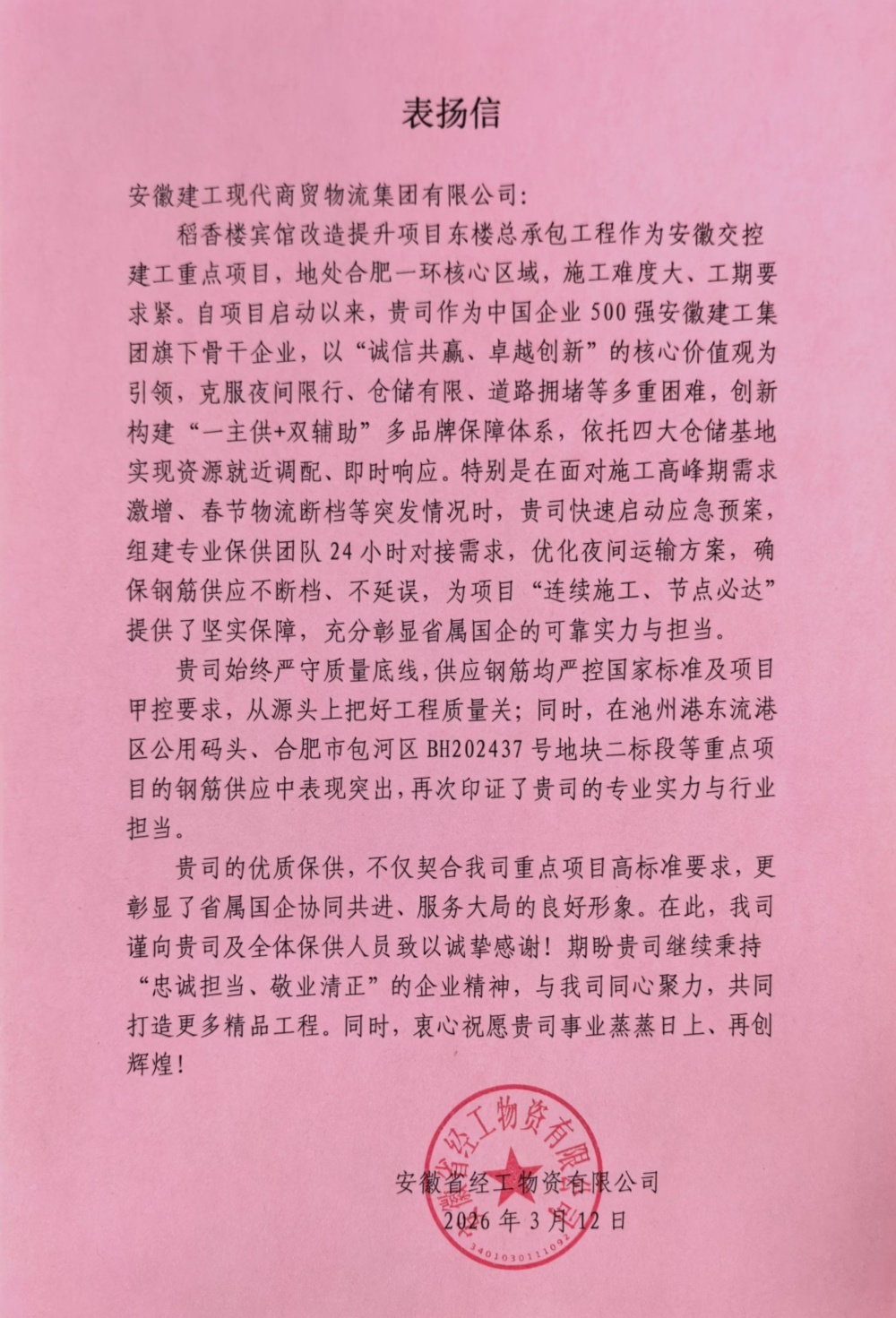 除稻香樓賓館改造項(xiàng)目外,在池州港東流港區(qū)公用碼頭、包河BH202437號地塊等重點(diǎn)項(xiàng)目的物資供應(yīng)中,同樣贏得客戶高度贊揚(yáng)。一封表揚(yáng)信,一份新動力。下一步,建工商貿(mào)物流將持續(xù)深耕供應(yīng)鏈服務(wù),以更專業(yè)的能力、更高效的保障,攜手合作伙伴共筑精品工程,為城市建設(shè)貢獻(xiàn)國企力量。